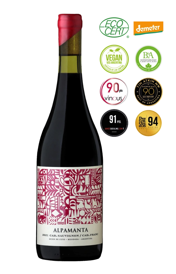 Tasting notes: 2021 Alpamanta Cabernet Franc-Cabernet Sauvignon displays a deep purple-red colour. On the nose, it reveals balsamic undertones, followed by aromatic nuances evoking cooked bell peppers and a medley of spices, including black pepper and clove. On the palate is perceived as intense with a creamy long-lasting end.